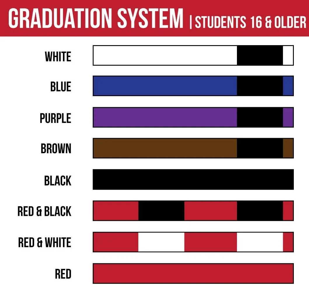 Generally, most instructors and schools include the belts with the white stripes and black stripes as an added incentive for promotion. The table below illustrates the minimum age for each coloured belt.