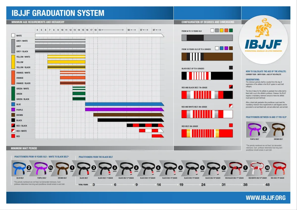 • IBJJF rules state an instructor can only grade as long as they are 2 belts above the student to be graded. For example, a brown belt can grade to blue, a black belt can grade to purple etc.